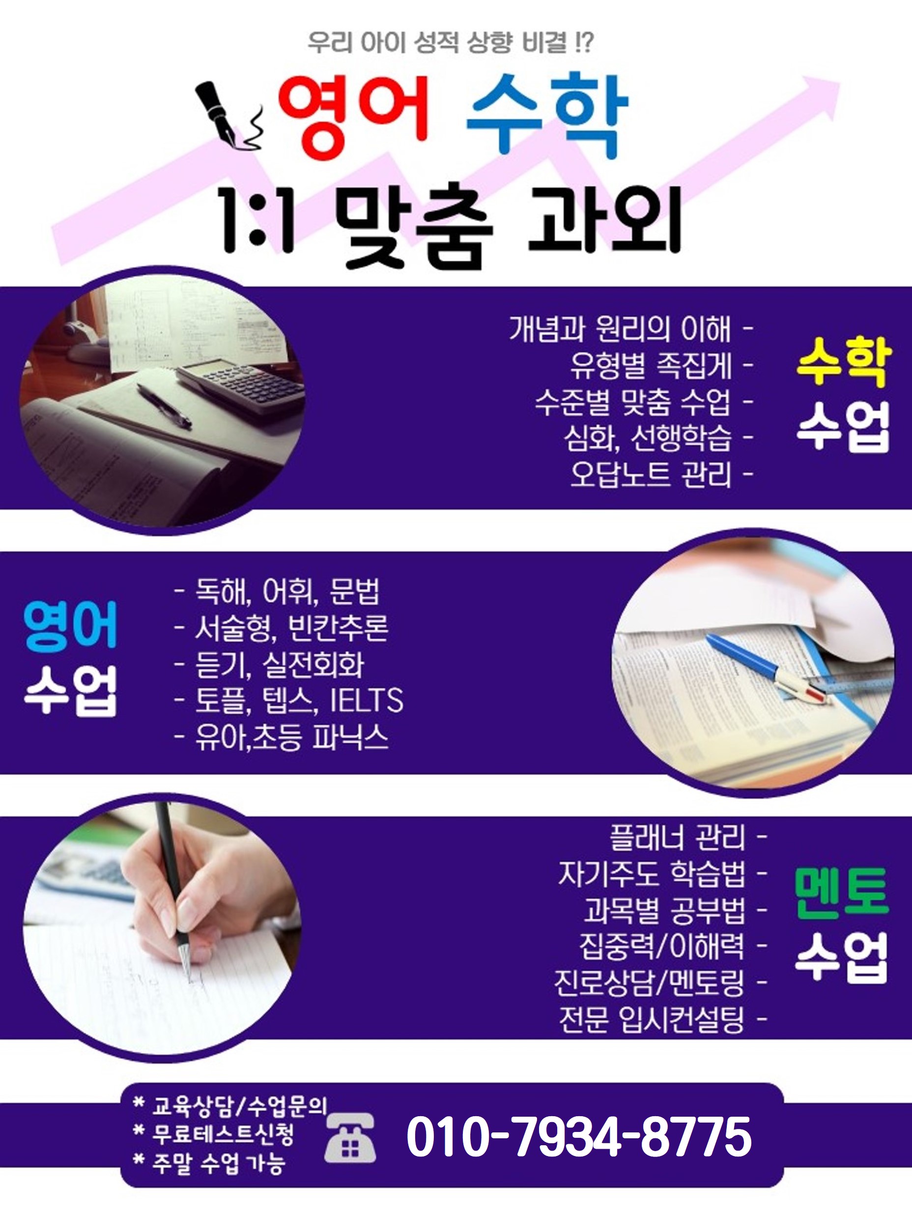 그동안 많은 학생들을 수업 해오면서 학생들 중에 가장 기억에 남았던 아이를 한번 다시 이야기 해보려고 합니다 약 7년 8년 동안 수업을 해왔고 수없이 많은 학생들을 접해왔습니다 그 중에는 현재 고2 아직까지 저와 수업을 진행하고 있는 학생 이야기를 해보겠습니다 물론 학생의 동의를 얻은 후에 작성하는 것이기 때문에 걱정하지 않으셔도 됩니다 이 학생은 중학교 1학년때부터 꾸준하게 수업해온 학생입니다 물론 공부에 영 소질이 없다고 어머님께서 먼저 연락주시고 찾아주시긴 했지만 학생을 만나보니까 왜 그런 말씀을 하셨는지 알겠더라구요 처음에 만났던 학생의 첫 모습은 많이 위축되어 보이기도 했습니다 공부에 흥미가 떨어져있기 보다는 아예 전체적인 자신감이 많이 없어보였어요 그래서 더 신경이 쓰이고 눈길이 갔던것도 있습니다 첫 수업 시작했을때 테스트를 해봤는데 오류동 과외 오류동 국어과외 오류동 영어과외 많이 풀지 못 하는 문제가 많고 고민하는 시간도 없이 그냥 안풀고 넘어가더라구요 조금이라도 어려운 문제들은 풀지 않으려고 하는걸 보면서 고민하는 힘이나 생각하는 힘이 구로과외 구로국어과외 구로영어과외 많이 부족한 학생이라고 생각했습니다 실제로도 그랬구요 외고과외 예고과외 고등학교과외 중학교과외 초등학교과외 구로초등국어과외 구로초등영어과외 구로중등국어과외 구로중등영어과외 구로고등국어과외 구로고등영어과외 어머님 말씀을 들어보면 그래도 초등학생때는 어려운 점 없이 공부도 줄 곧 잘 했다고 말씀하셨는데 오류동국어과외 오류동사회과외 오류동과학과외 오류동물리과외 오류동화학과외 중학생 올라오고 나서 유독 그런 모습이 많이 보인다고 하셨어요 그런데 실제로도 중학교 진학 하고 나서 공부에 손을 놓는 학생들이 정말 많아요 사춘기 때문에도 그렇고 조금씩 어려워지는 교과과정에 적응이 안돼서 그냥 바로 포기하고 공부를 하지 않는 학생들이죠 구로초등학생과외 구로중학생과외 구로고등학생과외 물론 그렇지 않는 학생들도 있습니다 초등학생때부터 잘 준비를 해왔거나 어려운 문제가 나와도 본인이 스스로 해결하려고 하는 그런 꾸준한 자세를 가진 학생들이죠 제가 수업했던 학생도 중학교 올라오고 나서 공부를 어려워했던 흔한 케이스지만 뭔가 상황이 다른 학생들과는 느낌이 달랐습니다 우선 자신감이 너무 없어보이는 모습이 가장 신경쓰이기도 했구요 오류동초등국어과외 오류동초등영어과외 오류동중등국어과외 오류동중등영어과외 오류동고등국어과외 오류동고등영어과외 학생과 수업을 지속하면서 이야기도 많이 나눠봤는데 가장 큰 이유가 선생님과 부모님의 꾸중인것 같았어요 조금 어려워하고 문제를 한두문제 풀지 못한다고 하면 그동안 많이 혼났었다고 말을 하더라구요 그게 계속 지속되어 쌓여가다 보니까 학생도 그냥 바로 포기하는게 많아졌고 공부 의욕이 많이 사라졌다고 했었어요 그래서 그때부터 최대한 쉬운 문제 응용문제더라도 학생의 수준 안에서 많이 풀어보게 하고 칭찬을 정말 아낌없이 해준 듯 합니다 오류동 초등학생과외 오류동 중학생과외 오류동 고등학생과외 그때부터 뭔가 학생 눈빛도 달라지도 태도도 달라졌어요 본인도 할 수 있다는 생각을 갖자마자 정말 적극적인 학생으로 변하더라구요 하고싶은것도 되게 많아졌고 꿈과 진로도 생기게 되더니 이제는 입시 준비로 아주 바쁜 보통의 고등학생의 모습입니다 성적은 엄청나게 높진 않지만 그래도 노력하는 모습이 보여서 오류동중1과외 오류동중2과외 오류동중3과외 오류동고1과외 오류동고2과외 오류동고3과외 정말 좋게 변화됐다고 생각하는 학생이에요 학생들의 공부는 무조건 문제를 많이 푼다고 해결되는 것이 아닙니다 우리 아이가 공부를 어려워하는 학생인가요 그런데도 그냥 어떻게 해야할지 몰라서 내버려두고 있는건 아닌가요 오류동수능대비과외 오류동내신대비과외 오류동시험대비과외 오류동중간고사대비과외 오류동기말고사대비과외 오류동방학대비과외 그냥 공부에 소질이 없어서 공부를 못하는 것이 아닙니다 아이들의 학습은 그동안의 습관에 의해서 결정됩니다 지금까지 한번도 신경써본적이 없다면 다시한번 되돌아보고 잡아주어야 합니다 수업을 한번 듣고 넘기는 학생 집에서 공부하는 시간을 갖지 않는 학생 등등 공부 습관적으로 문제가 있는 학생들이 많습니다 이런 아이들은 대부분 자기주도학습 능력이 떨어지며 당연히 성적 또한 낮게 나올 수밖에 없습니다 궁동초등국어과외 궁동초등영어과외 궁동중등국어과외 궁동중등영어과외 궁동고등국어과외 궁동고등영어과외 궁동중1과외 궁동중2과외 궁동중3과외 궁동고1과외 궁동고2과외 궁동고3과외